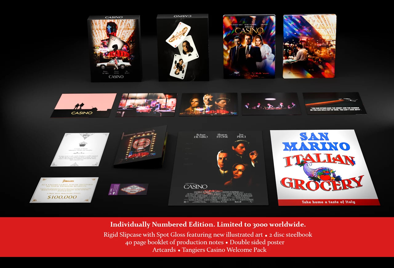Extras:Language(s): English, Czech, French, Hungarian, Polish, Russian (voiceover), Hard of Hearing Subtitles: English, Subtitles: Complex Mandarin, Czech, Danish, Dutch, Finnish, French, Greek, Hungarian, Korean, Norwegian, Polish, Romanian, Simplified Mandarin, Swedish, Interactive Menu, Screen ratio 1 - 2.35:1, DTS-X, DTS 5.1, Booklet, Bonus Footage, Deleted Scenes, Documentaries: 'Vegas and the Mob'; 'History Alive: True Crime Authors: 'Casino' with Nicholas Pileggi', Double-sided poster; 5 artcards; Tangiers Casino Welcome Pack; Moments with Martin Scorsese, Sharon Stone, Nicholas Pileggi and more